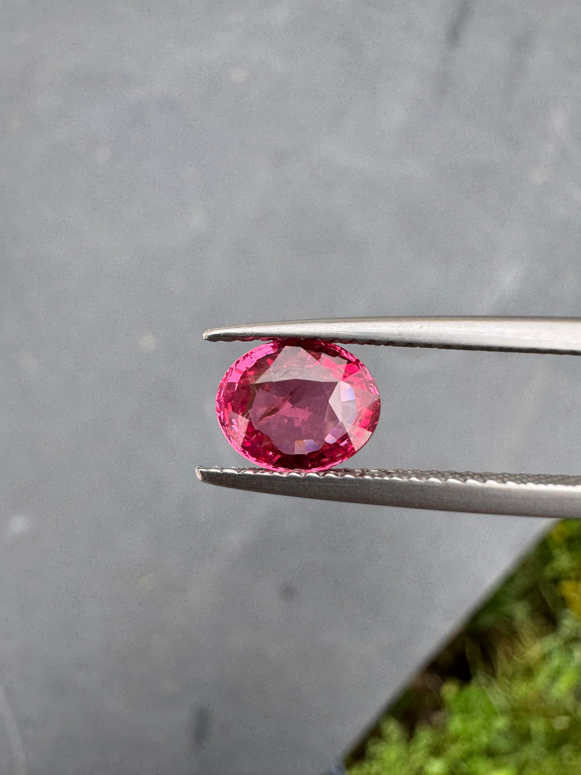 Spinelle de Mahenge d'une exceptionnelle limpidité, taillée en ovale pour sublimer sa brillance naturelle. Cette pierre de 1,56 carat révèle une clarté remarquable, caractéristique des meilleures spinelles de cette région tanzanienne réputée. Sa teinte profonde et son éclat cristallin en font une gemme de choix pour les collectionneurs et les créations joaillières exigeantes. Une pièce rare combinant pureté optique et intensité chromatique.