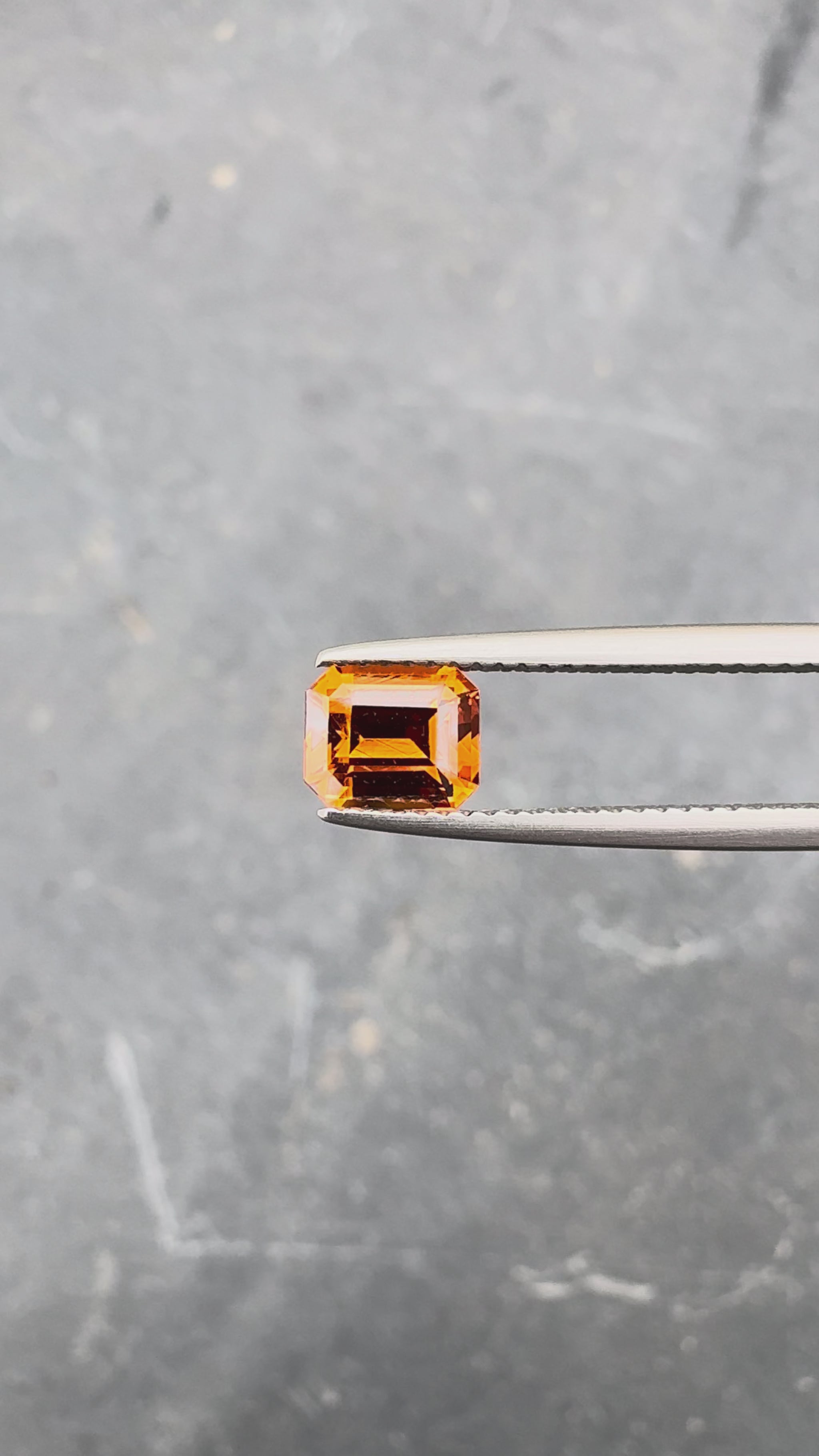 Grenat spessartite d'une teinte orange éclatante, cette pierre précieuse de 1,53 carat révèle toute sa splendeur en taille émeraude. Cette géométrie classique met en valeur la transparence et la vivacité chromatique caractéristiques de cette variété rare. Le spessartite, apprécié des collectionneurs pour son intensité de couleur naturelle, offre une alternative distinguée aux pierres traditionnelles. Idéal pour une création joaillière personnalisée ou un investissement en gemmologie.