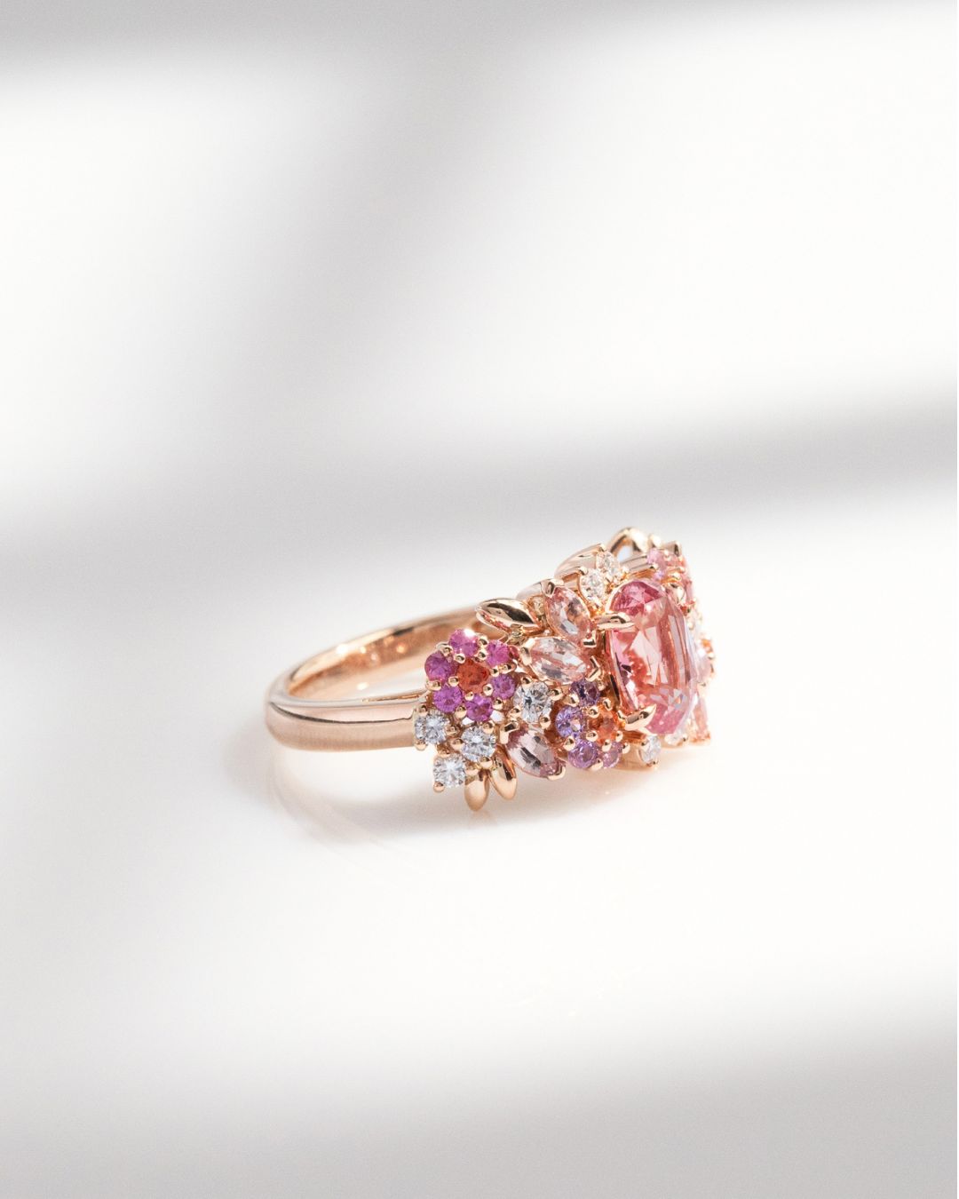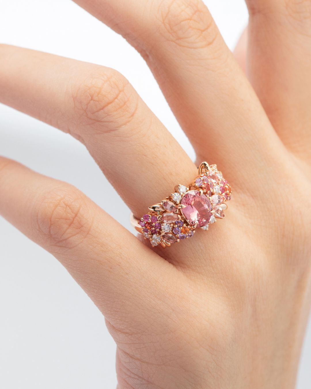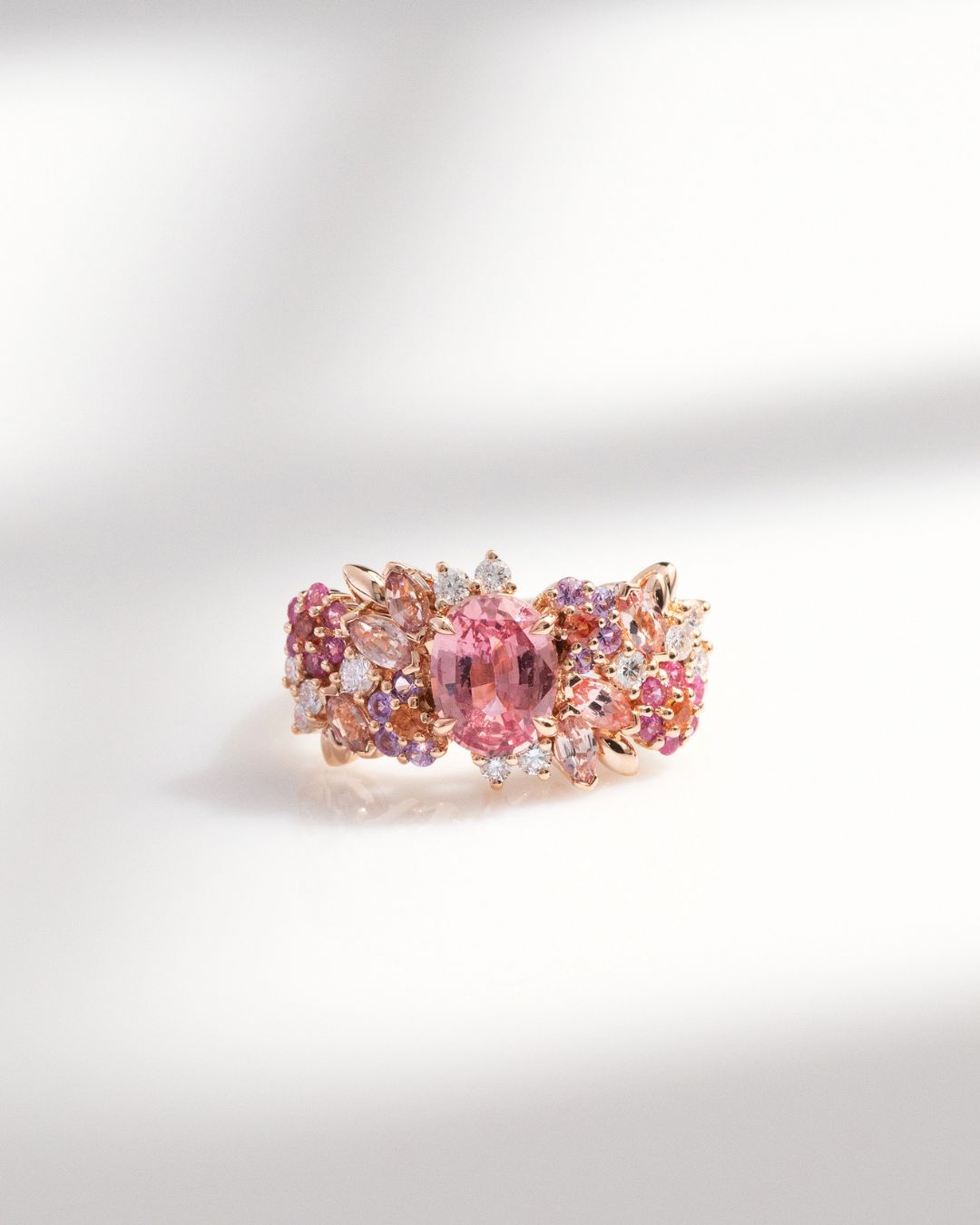 La bague padparadscha Bloom est une pièce d’exception qui célèbre l’harmonie des couleurs pastels. En son centre trône un rare saphir padparadscha taille ovale, dont la profondeur et l’équilibre rose-orange captivent le regard. Ce joyau est sublimé par un ensemble de saphirs rose et champagne orangé, créant un contraste délicat et lumineux. Véritable chef-d’œuvre de raffinement, Padparadscha Bloom incarne l’élégance et la rareté des pierres précieuses, pour une allure résolument intemporelle.