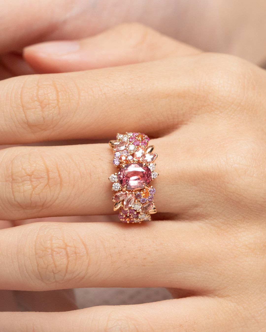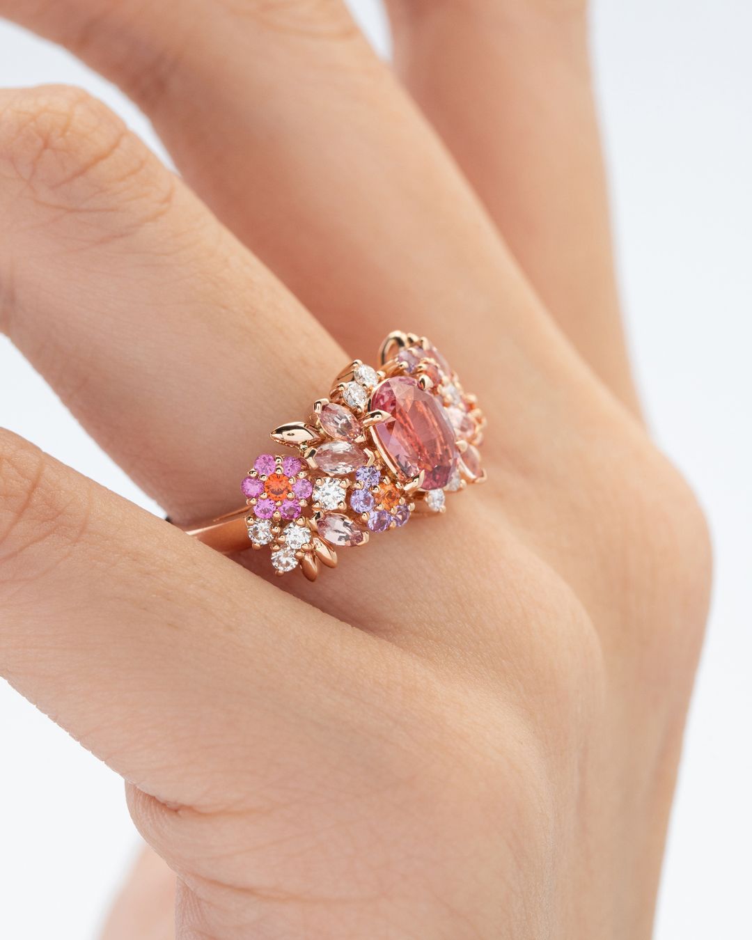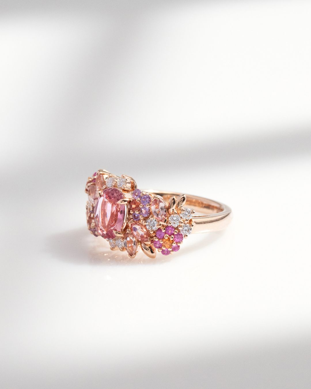 La bague padparadscha Bloom est une pièce d’exception qui célèbre l’harmonie des couleurs pastels. En son centre trône un rare saphir padparadscha taille ovale, dont la profondeur et l’équilibre rose-orange captivent le regard. Ce joyau est sublimé par un ensemble de saphirs rose et champagne orangé, créant un contraste délicat et lumineux. Véritable chef-d’œuvre de raffinement, Padparadscha Bloom incarne l’élégance et la rareté des pierres précieuses, pour une allure résolument intemporelle.