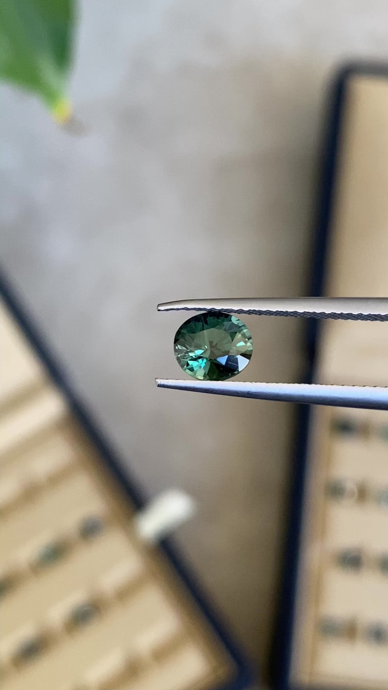 Saphir teal naturel de Madagascar, 1,19 carat, taille ovale. Cette pierre précieuse non chauffée présente une teinte teal distinctive, caractérisée par ses nuances bleu-vert subtiles et sa saturation remarquable. Originaire des gisements malgaches réputés, ce saphir offre une excellente clarté et une brillance naturelle.