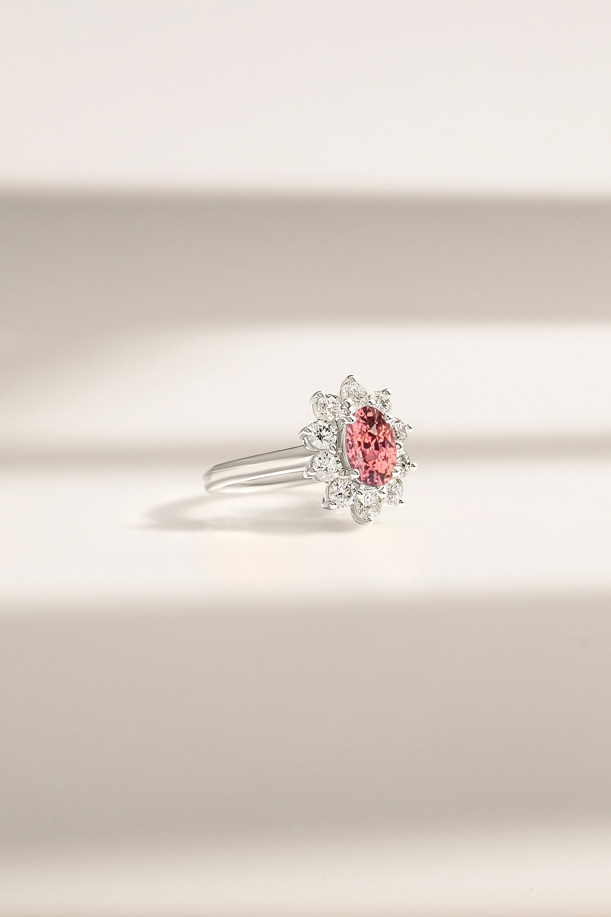 Découvrez cette bague avec son saphir padparadscha profond de 1.1 carats, taillée en ovale et originaire de Madagascar. Accompagné par des diamants ronds brillants, ce saphir est serti en or blanc 750 millièmes. Une création unique et intemporelle.
