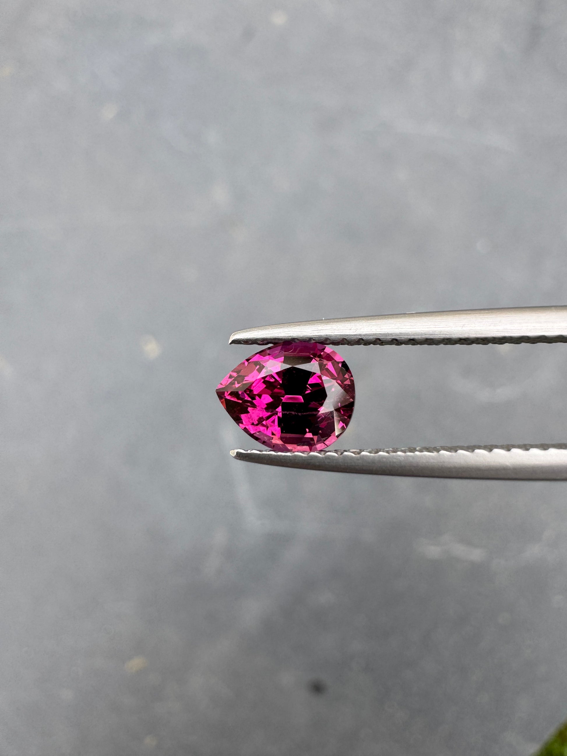 Grenat rhodolite de 1,42 carat présenté en taille poire, cette pierre précieuse captive par sa teinte rouge-rose profonde et caractéristique. La rhodolite, variété premium du grenat, se distingue par sa brillance exceptionnelle et sa transparence cristalline. La taille poire épouse parfaitement les qualités optiques de cette gemme, maximisant son éclat et sa profondeur de couleur. Idéale pour la joaillerie haut de gamme, cette pierre combine rareté et élégance intemporelle.