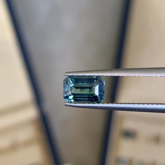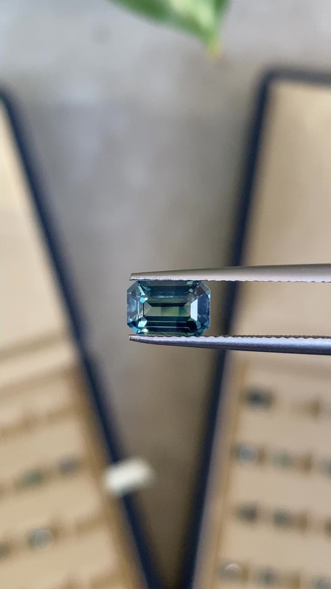Saphir teal naturel de Madagascar, 1,65 carat, taille émeraude. Cette pierre précieuse captive par sa teinte bleu-vert distinctive, caractéristique des saphirs de haute qualité originaires de l'île. La taille émeraude met en valeur la transparence et la profondeur de la couleur, révélant les nuances subtiles du bleu et du vert.
