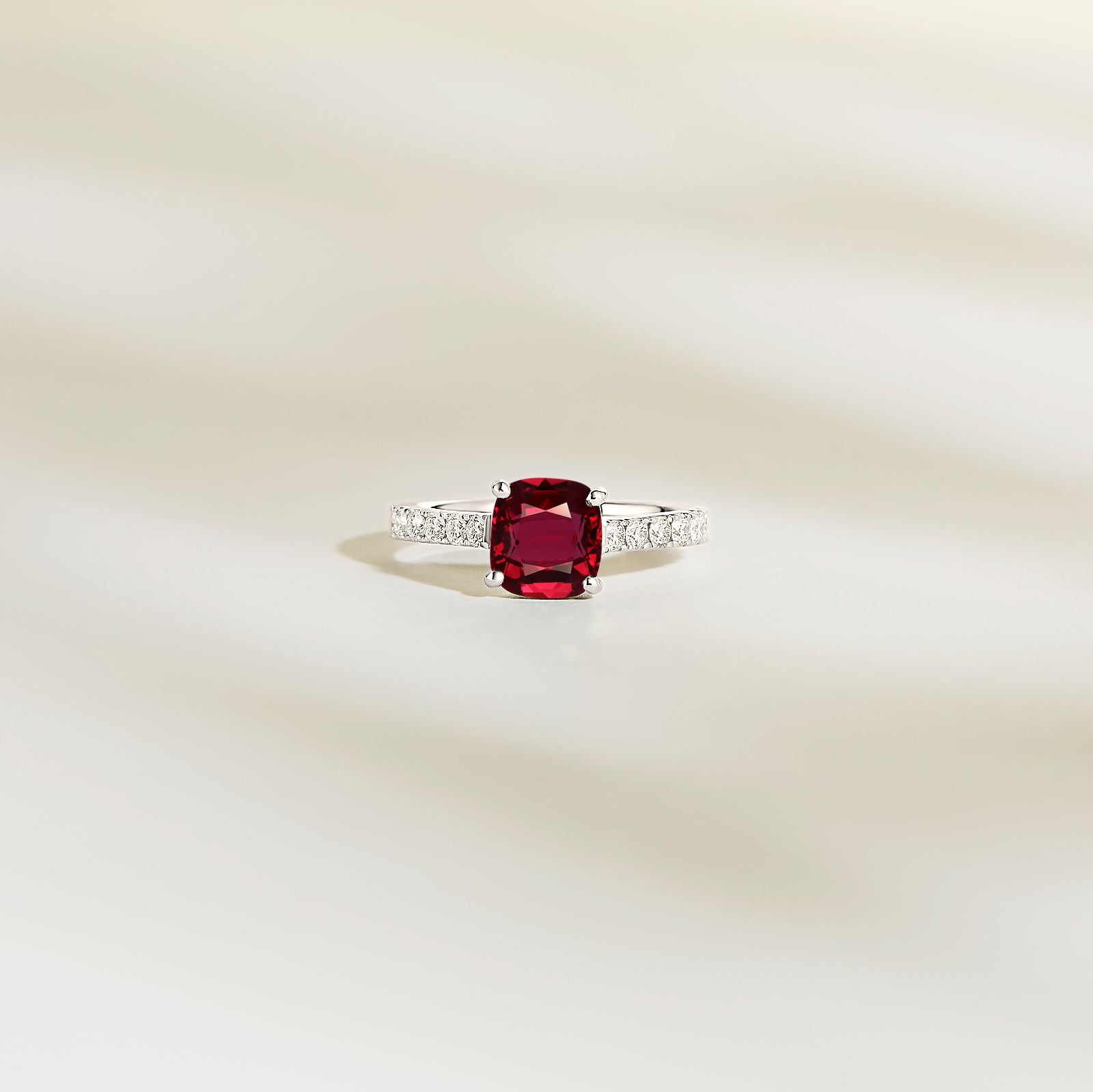 Découvrez cette bague avec son rubis profond de 1.50 carats, taillée en coussin et originaire du Mozambique. Accompagné par des diamants ronds, ce rubis est serti en or blanc 750 millièmes. Une création unique et intemporelle.