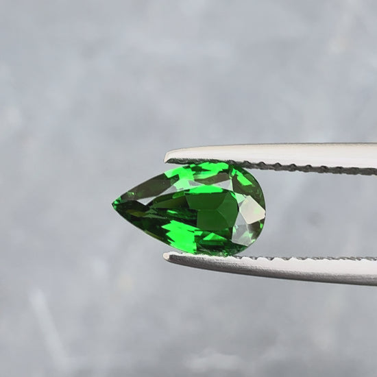 Grenat tsavorite vert de 1,05 carat, taillé en poire avec une précision remarquable. Cette gemme naturelle captive par sa teinte verte intense et sa brillance exceptionnelle. Le tsavorite, variété rare du grenat, se distingue par sa dispersion lumineuse supérieure et sa durabilité (7 à 7,5 Mohs). Idéal pour les créations joaillères exigeantes, cette pierre précieuse offre une alternative élégante aux pierres traditionnelles, combinant rareté et éclat intemporel.