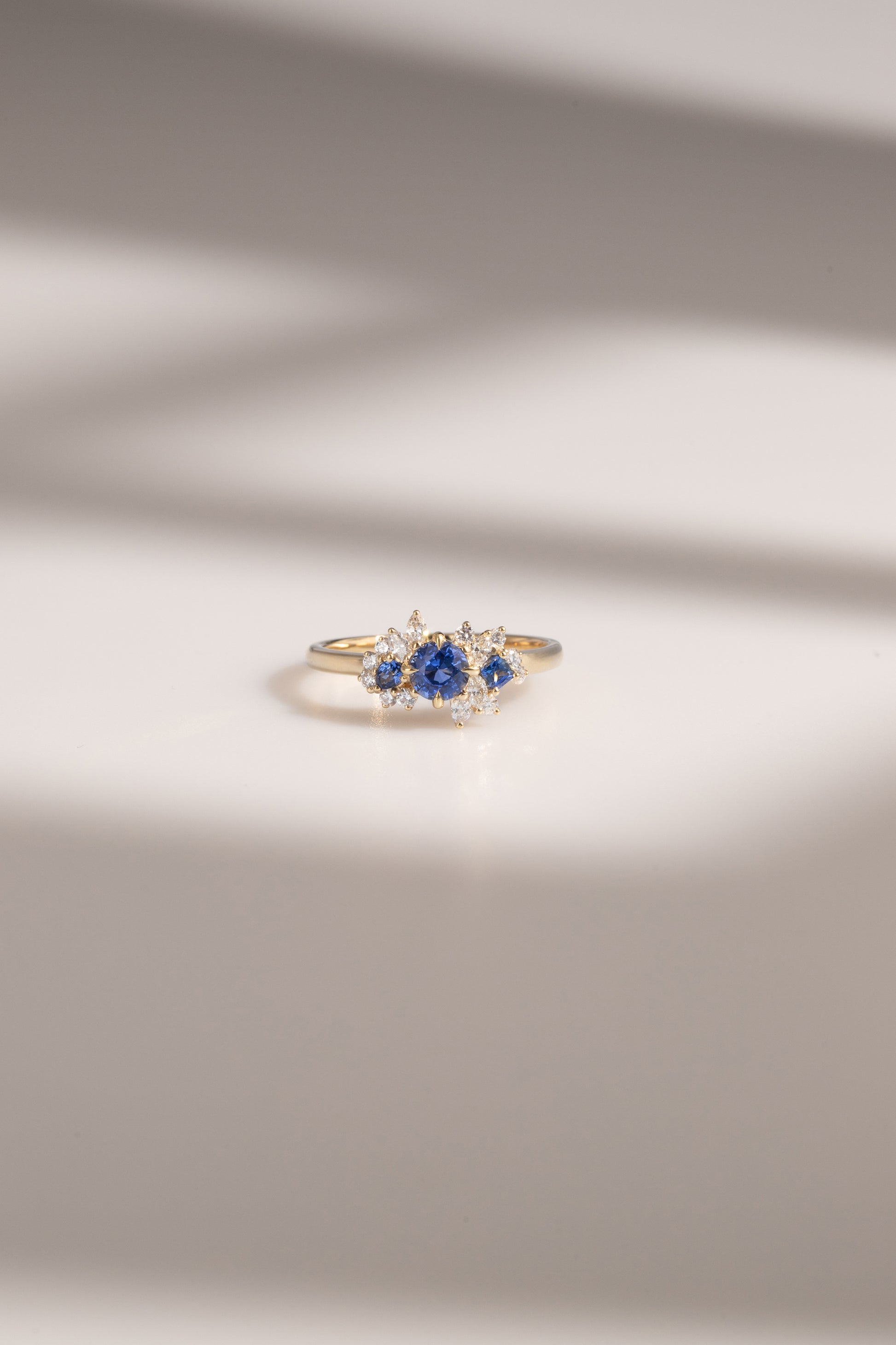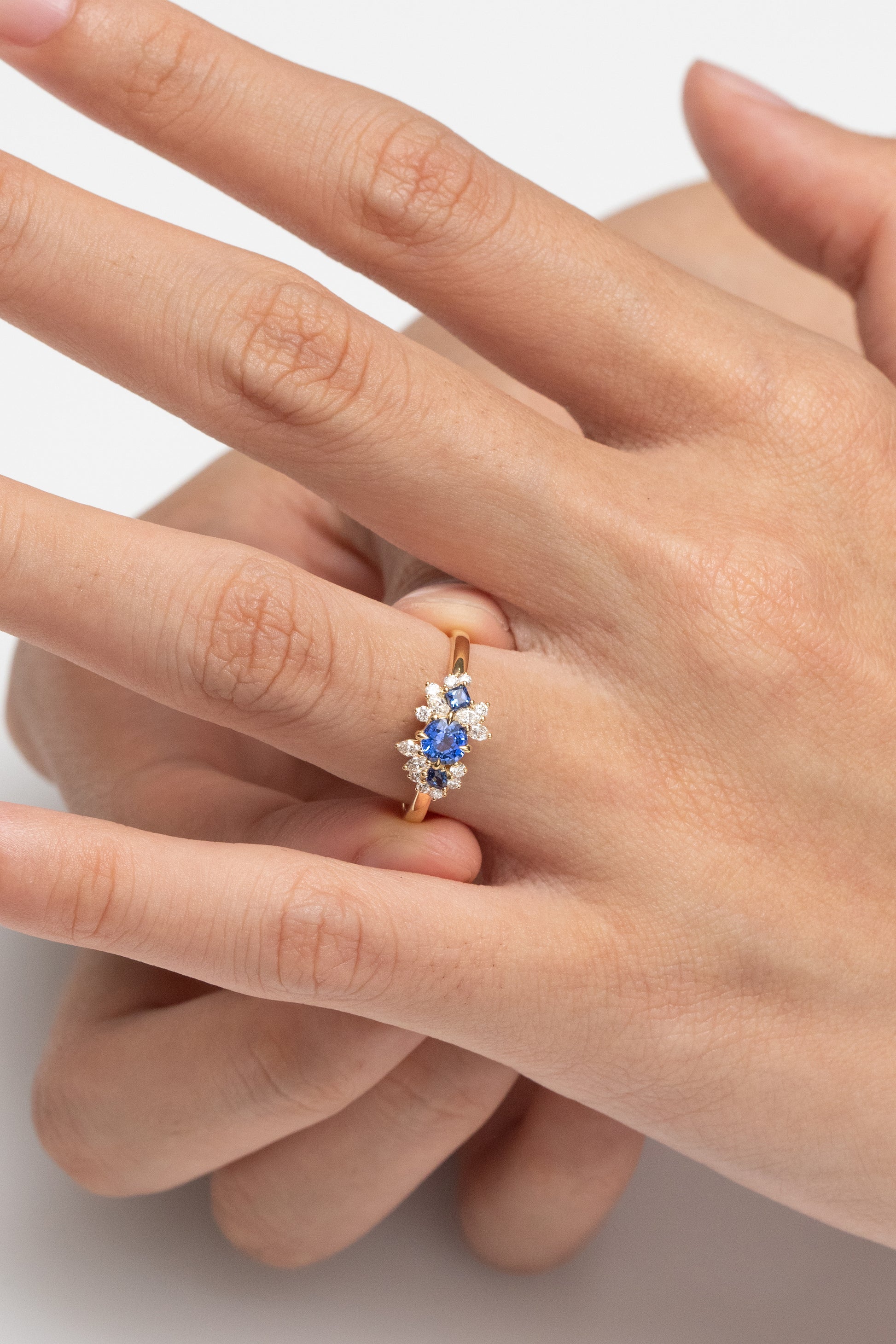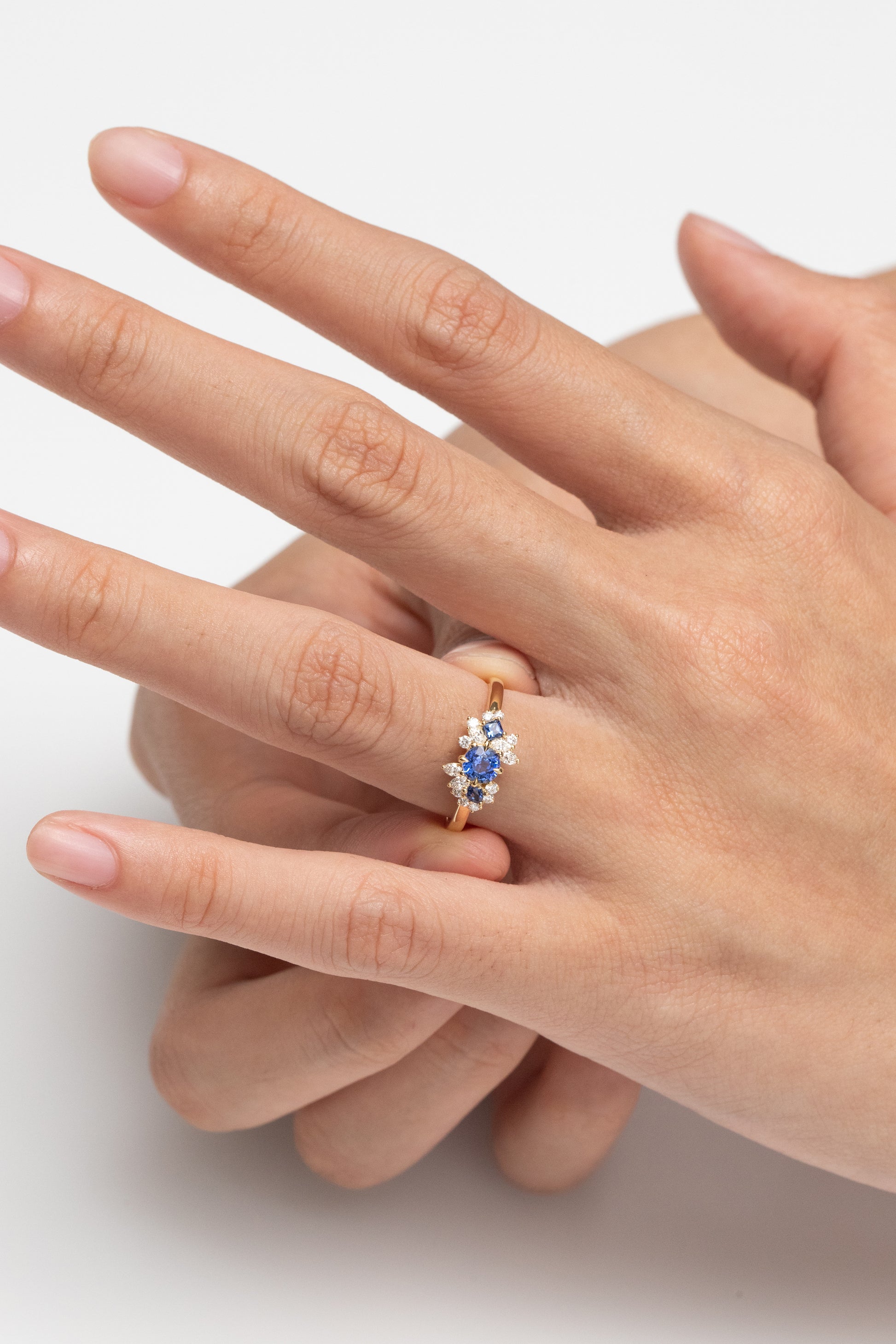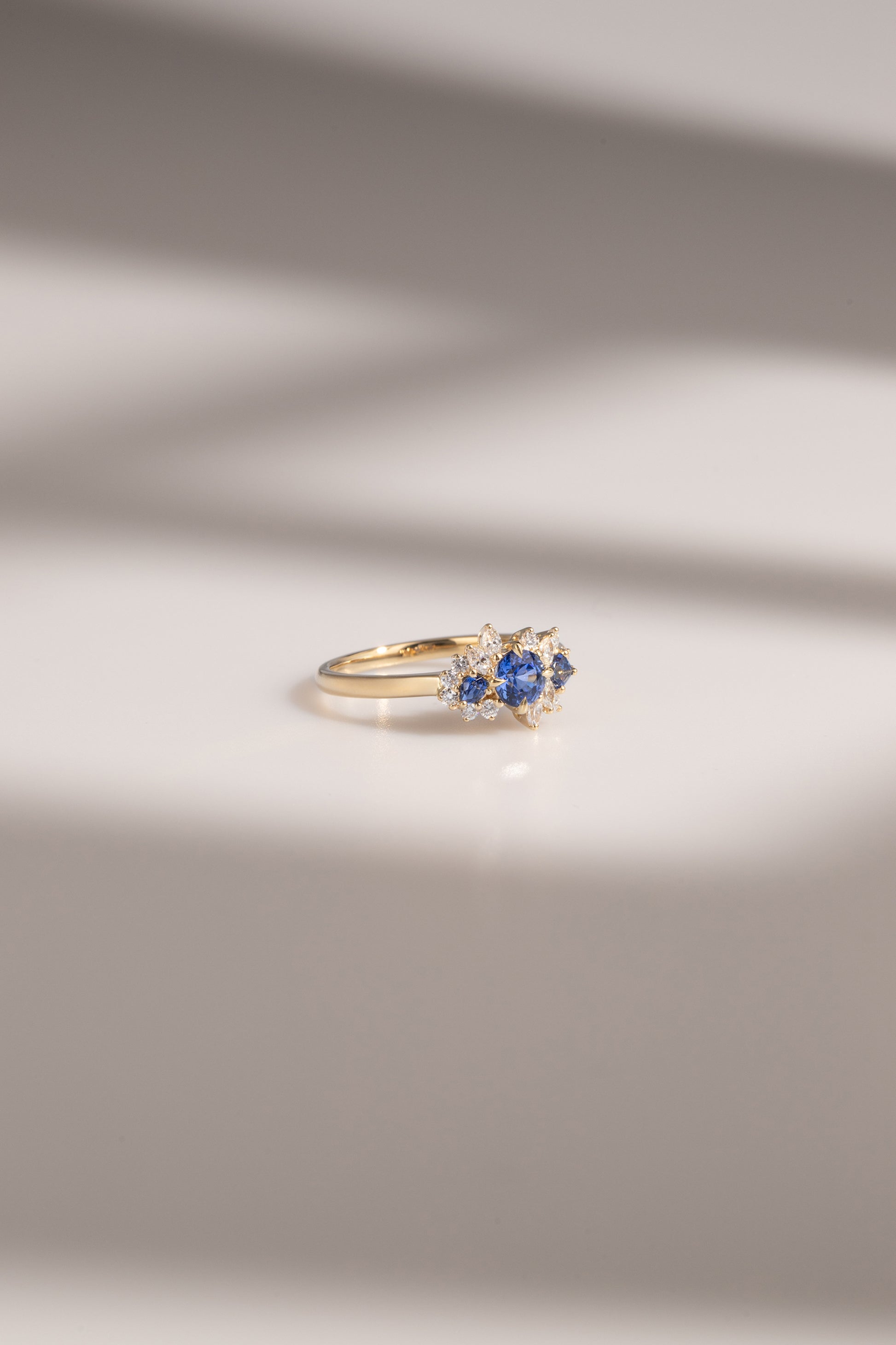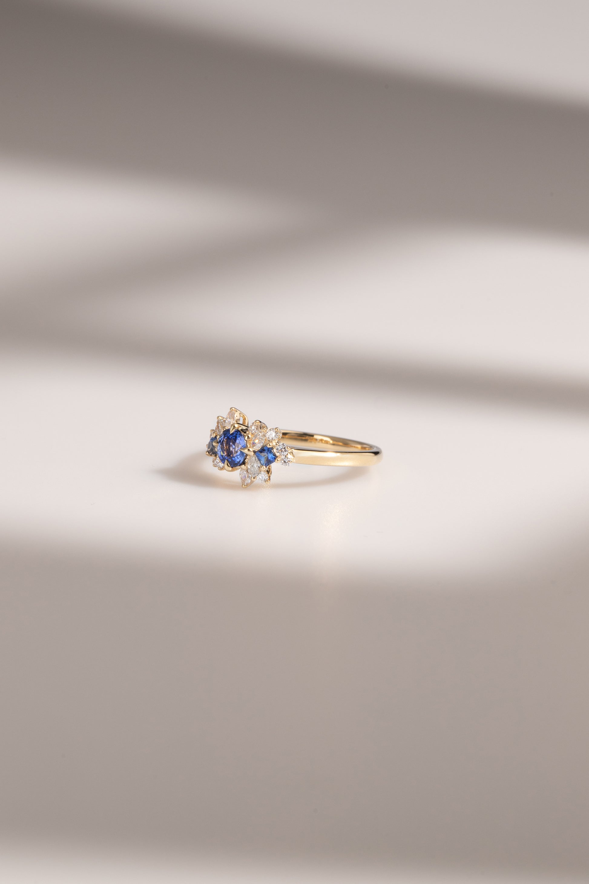 Bague délicate conjuguant l'élégance intemporelle à une esthétique contemporaine. Son saphir bleu rond, taille brillant, s'épanouit au cœur d'un motif floral épuré, sublimé par des diamants finement sertis. Cette composition minimaliste révèle une maîtrise joaillière raffinée, où chaque élément joue un rôle précis dans l'harmonie visuelle. Idéale pour les amateurs de pièces singulières alliant sobriété et sophistication.