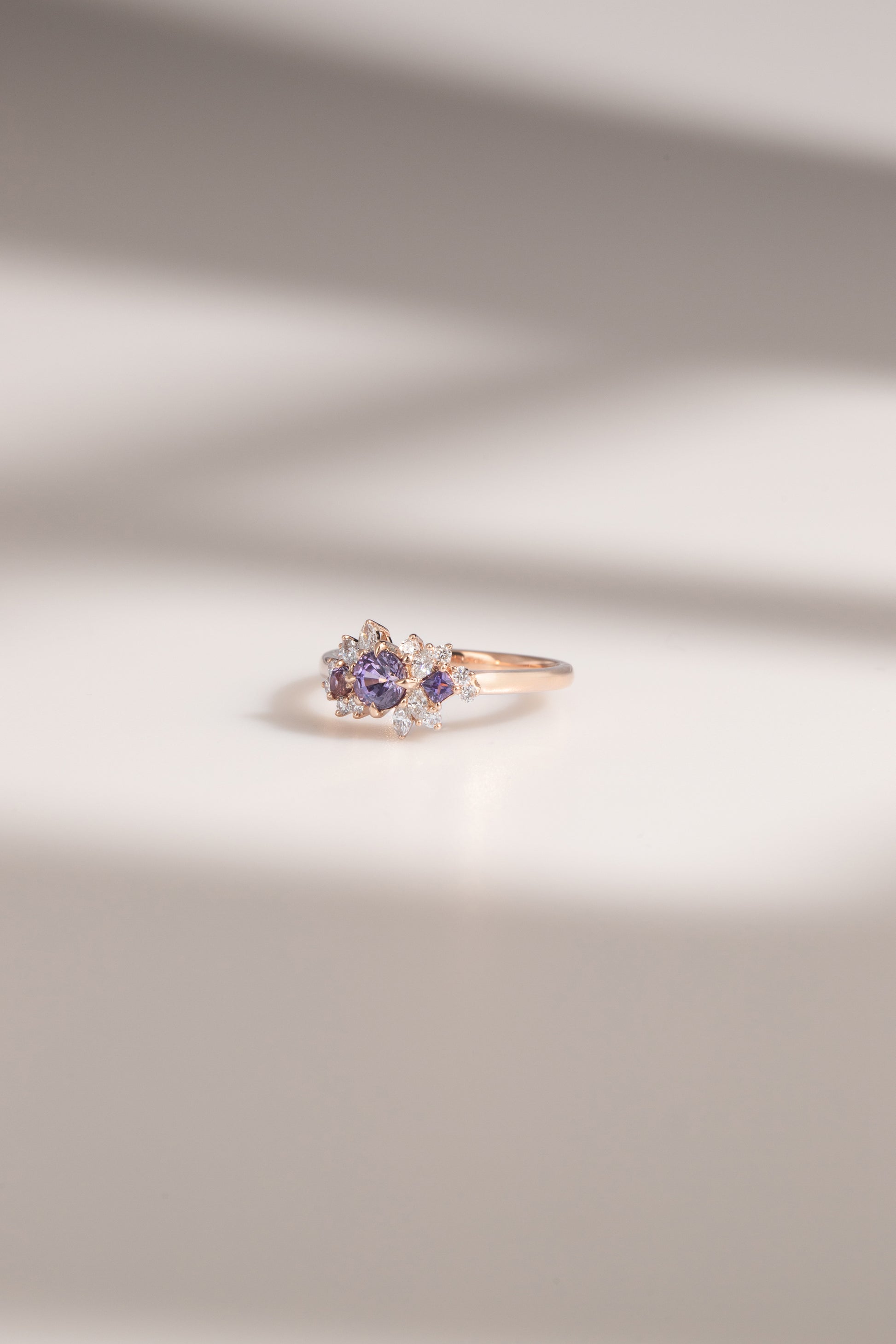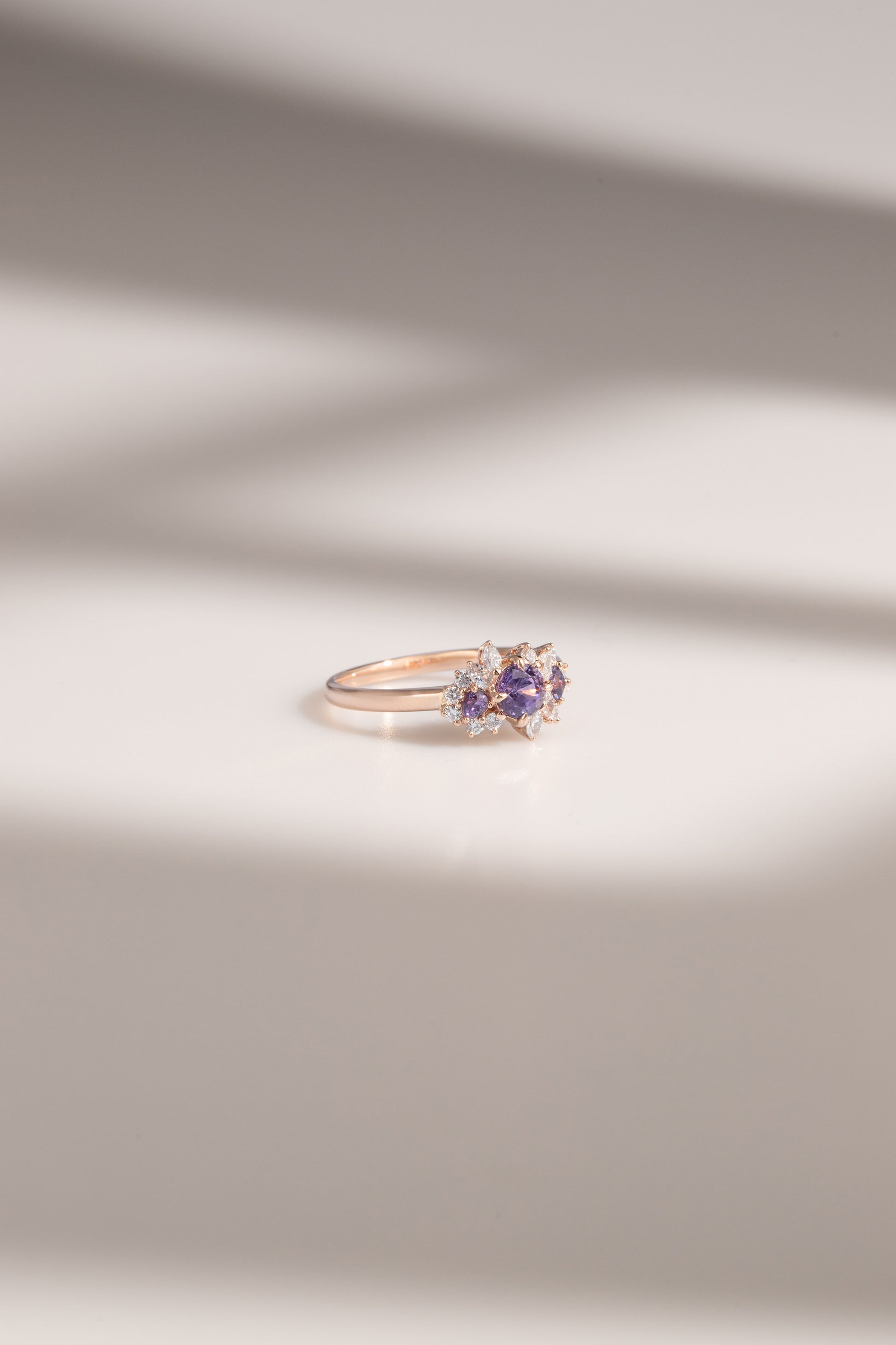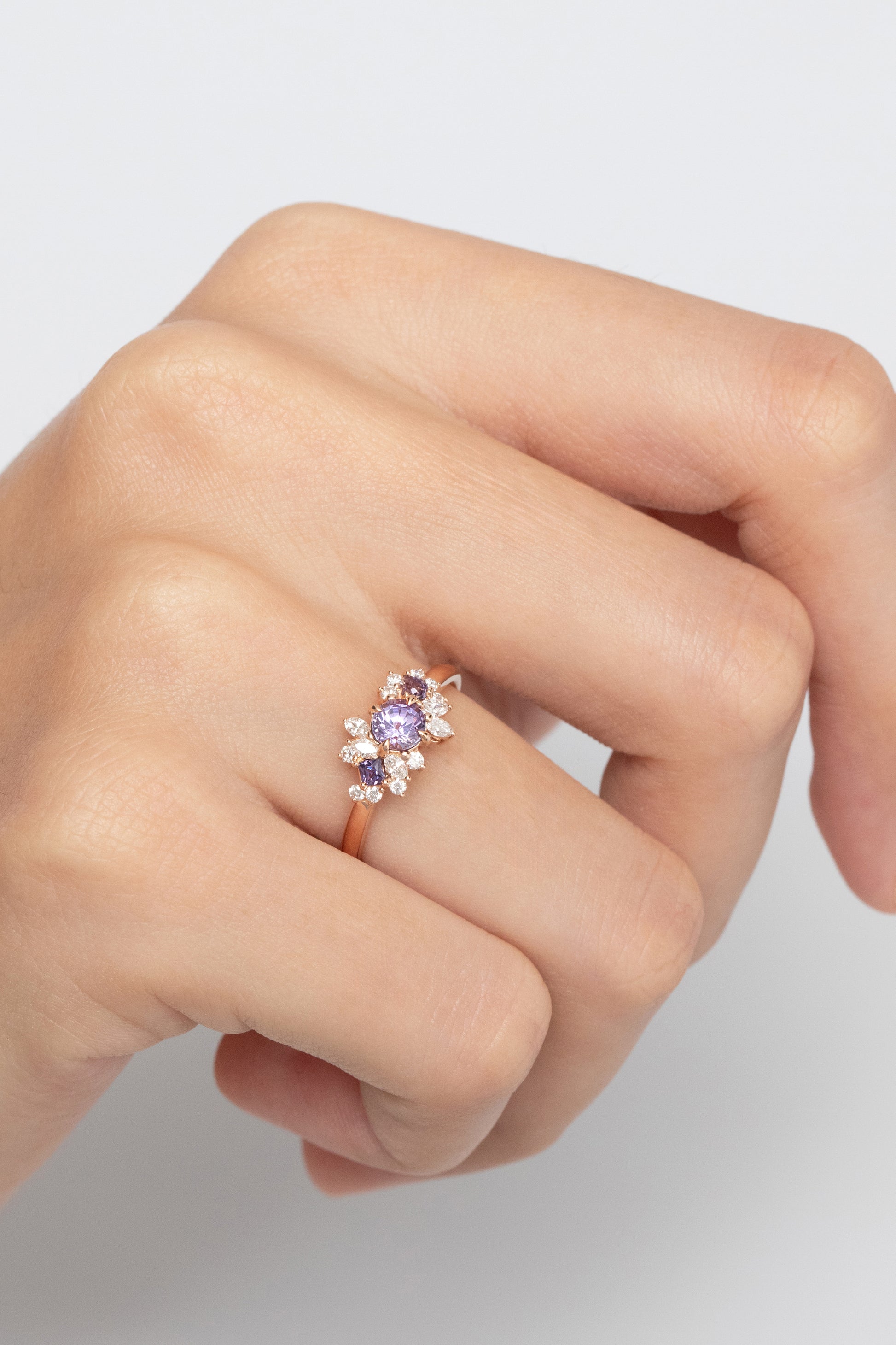 Découvrez la Mini Purple Bloom, une bague d'exception alliant finesse et sophistication. Son saphir violet rond, taille brillant, constitue le cœur de cette création délicate, sublimé par un halo de diamants étincelants. Le design épuré met en valeur la teinte profonde et envoûtante de la pierre précieuse, tandis que les diamants ajoutent une luminosité intemporelle. Parfaite pour les amateurs de bijoux raffinés, cette bague élégante se distingue par son profil fin et son allure incontestablement parisienne. Un choix idéal pour marquer les moments importants avec style et discrétion.
