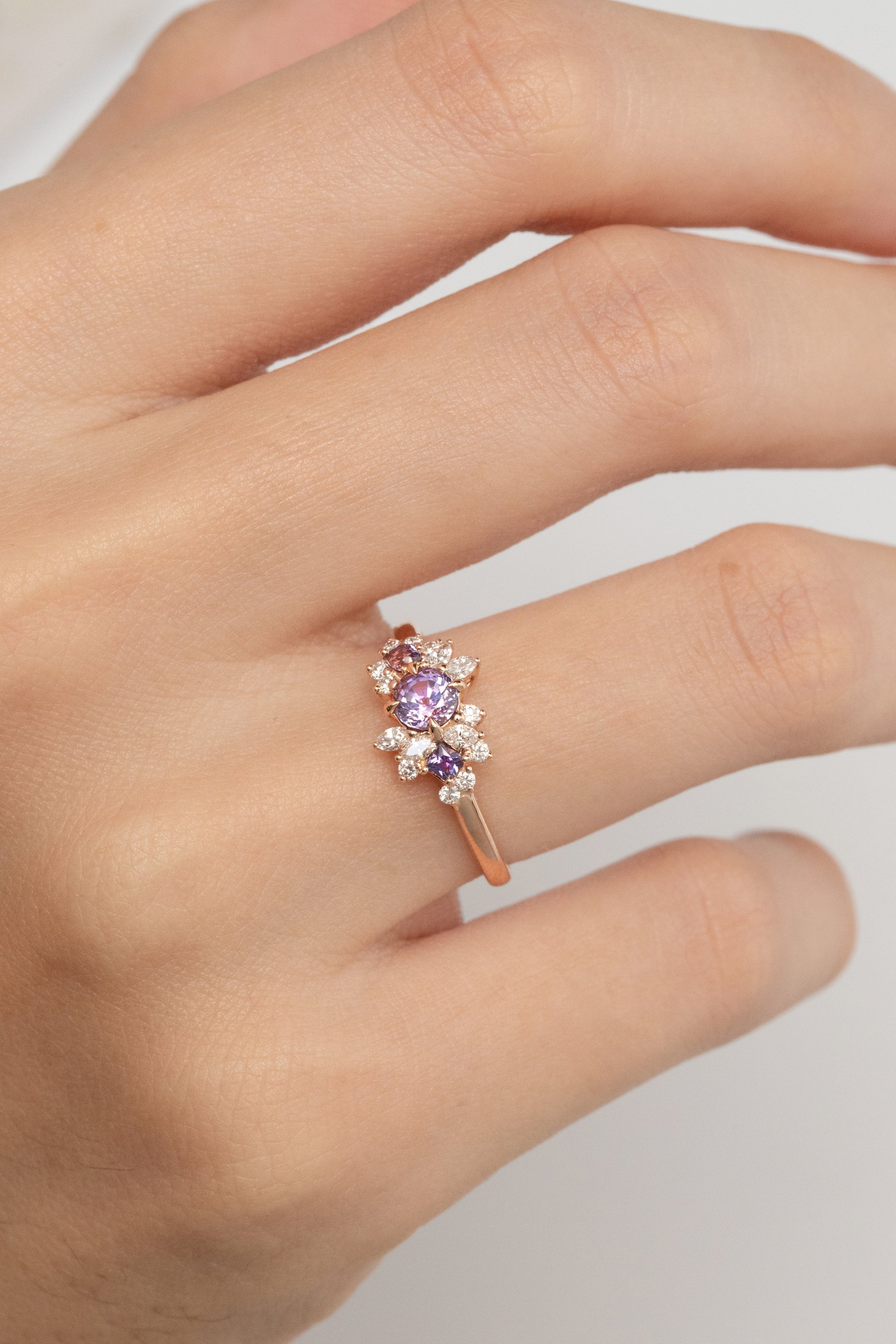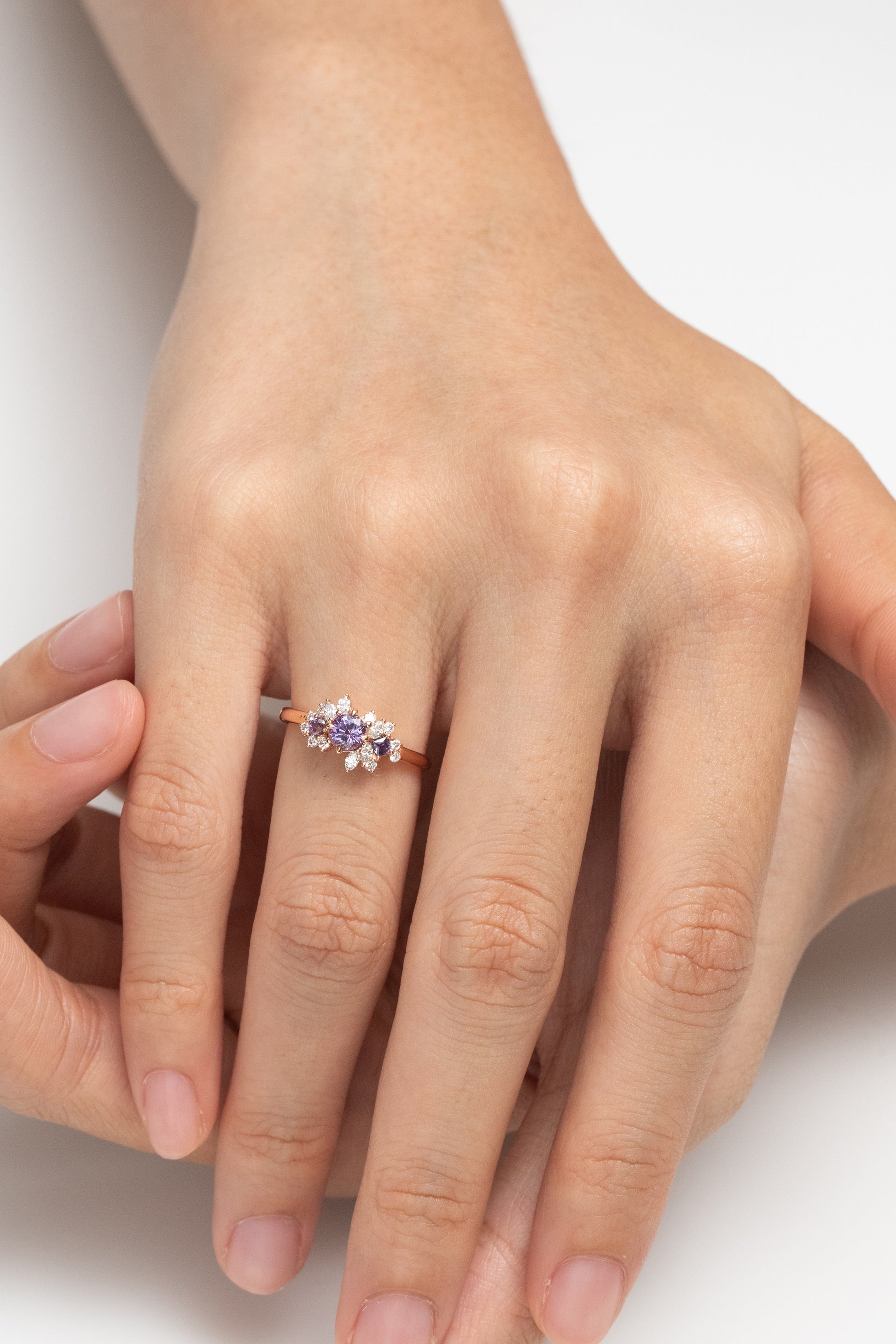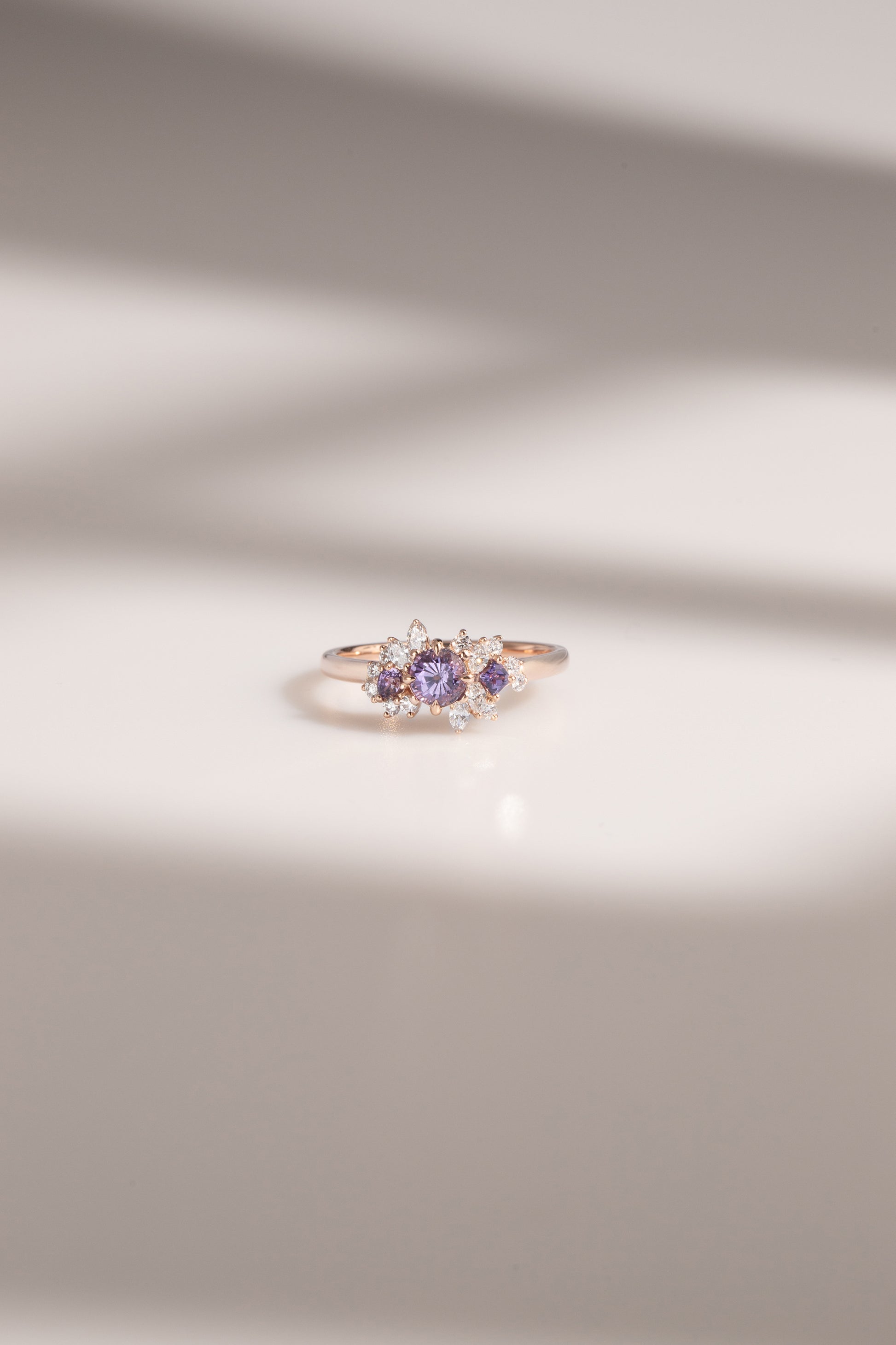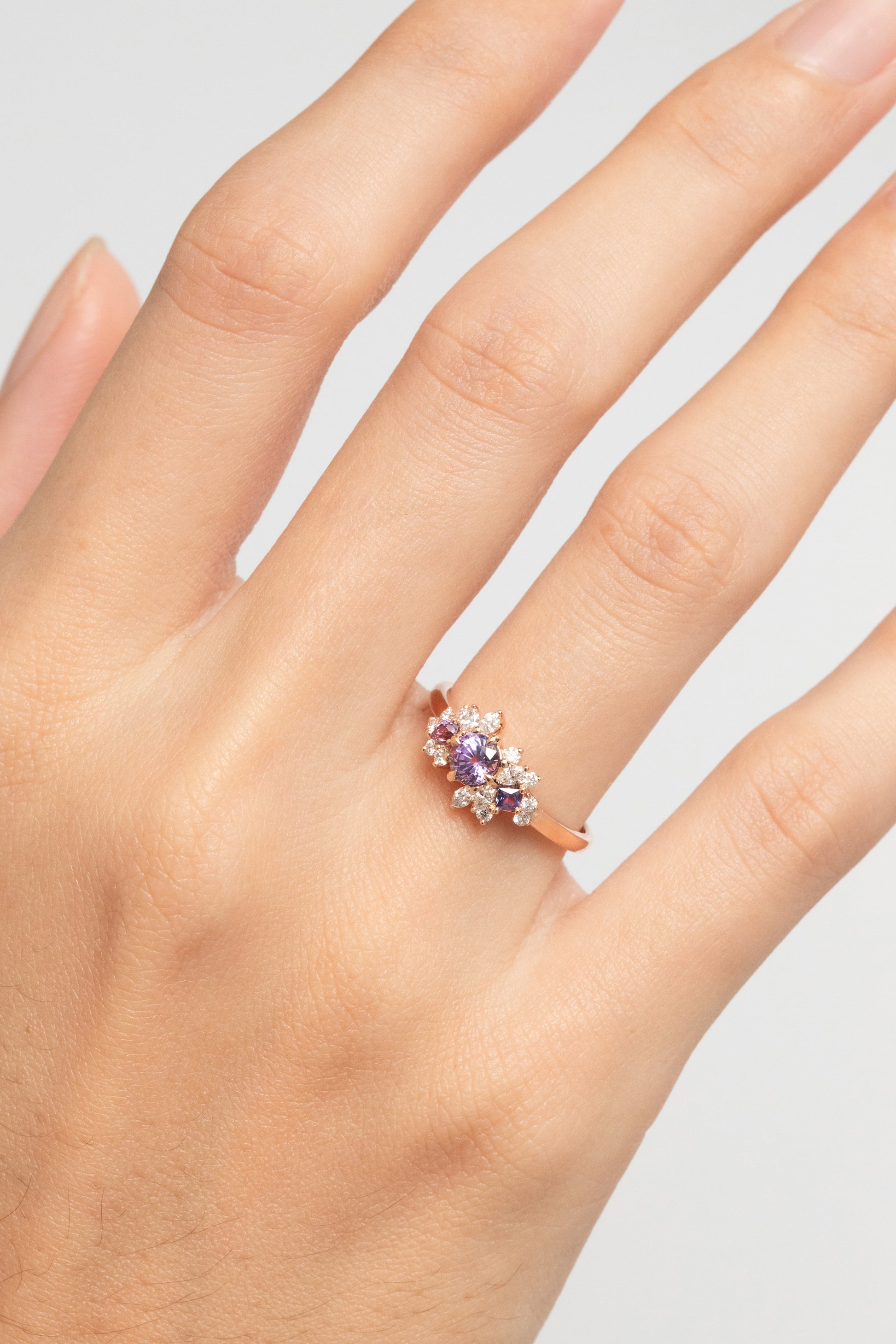 Découvrez la Mini Purple Bloom, une bague d'exception alliant finesse et sophistication. Son saphir violet rond, taille brillant, constitue le cœur de cette création délicate, sublimé par un halo de diamants étincelants. Le design épuré met en valeur la teinte profonde et envoûtante de la pierre précieuse, tandis que les diamants ajoutent une luminosité intemporelle. Parfaite pour les amateurs de bijoux raffinés, cette bague élégante se distingue par son profil fin et son allure incontestablement parisienne. Un choix idéal pour marquer les moments importants avec style et discrétion.