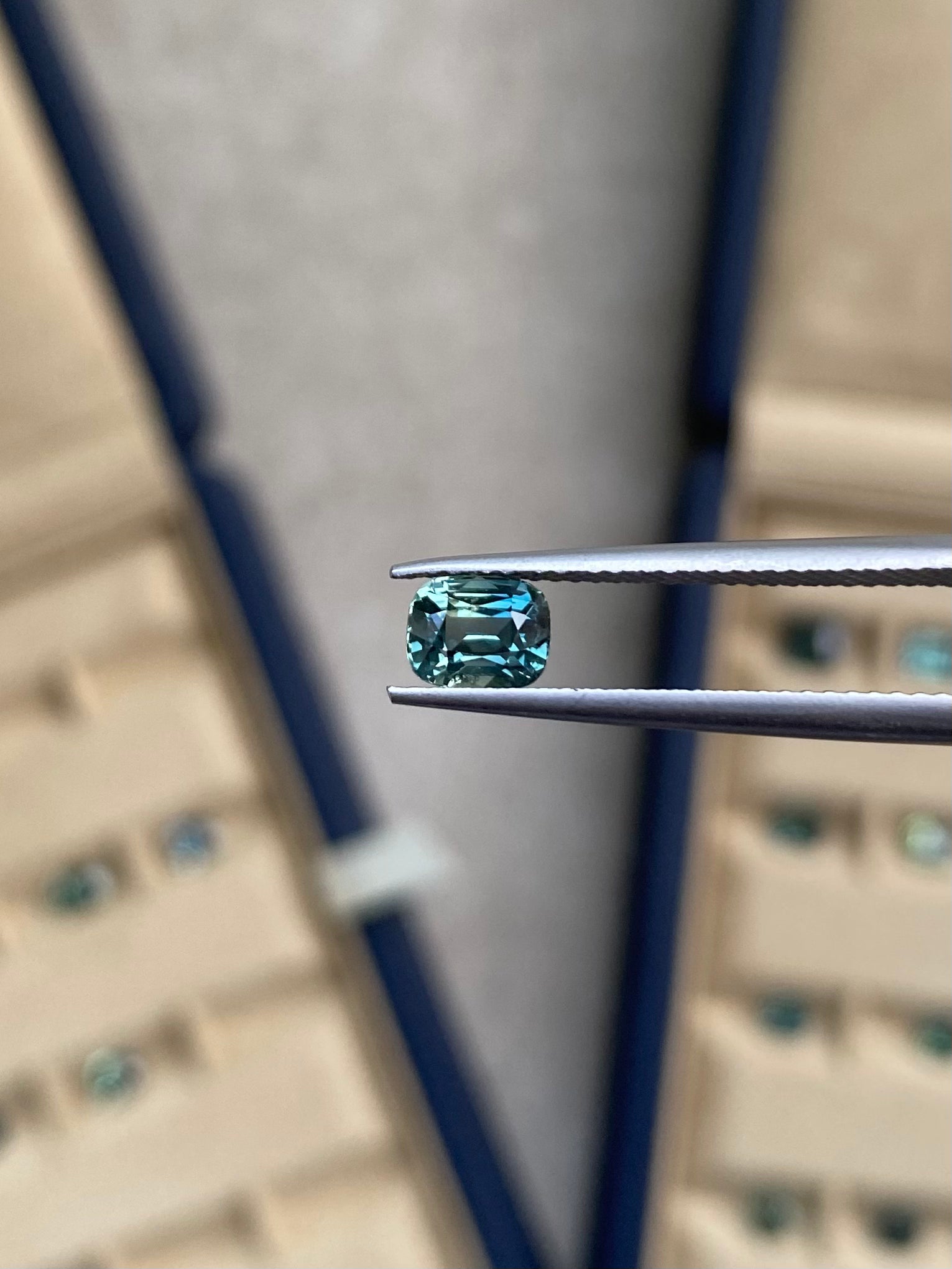 Saphir teal de Madagascar de 1,06 carat, taillé en coussin allongé avec précision. Cette gemme non chauffée présente une fusion harmonieuse de bleu et de vert, caractéristique du saphir teal, variété prisée des connaisseurs. La taille coussin allongé met en valeur la profondeur chromatique et l'éclat de la pierre, maximisant sa brillance naturelle. Provenant des mines malgaches réputées pour leur qualité exceptionnelle, ce saphir conserve son intégrité minéralogique sans traitement thermique.
