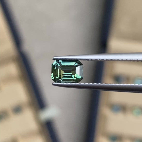 Saphir teal rectangle de Madagascar, cette pierre précieuse de 1,10 carat conserve toute son authenticité naturelle sans traitement thermique. Sa teinte bleu-vert caractéristique révèle la pureté minéralogique des gisements malgaches, prisée des collectionneurs et joailliers exigeants.