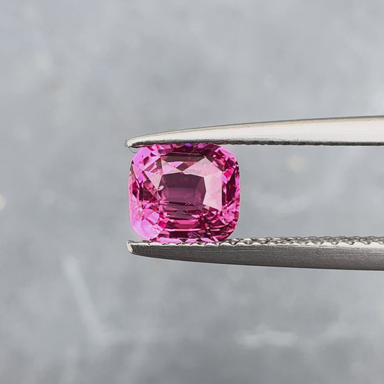 Spinelle naturelle de Mahenge d'une exceptionnelle pureté, taillée en coussin. Cette gemme de 1,22 carat révèle une teinte rouge-rose caractéristique des spinelles tanzaniennes, avec une brillance remarquable. Minéralogie fine pour collectionneurs et joailliers exigeants.